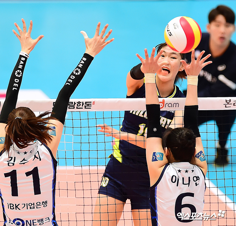 [엑스포츠뉴스 수원, 김한준 기자] 24일 오후 경기도 수원실내체육관에서 열린 2018-2019 도드람 V리그 현대건설과 IBK 기업은행의 여자부 경기, 현대건설 김주향이 공격을 시도하고 있다.