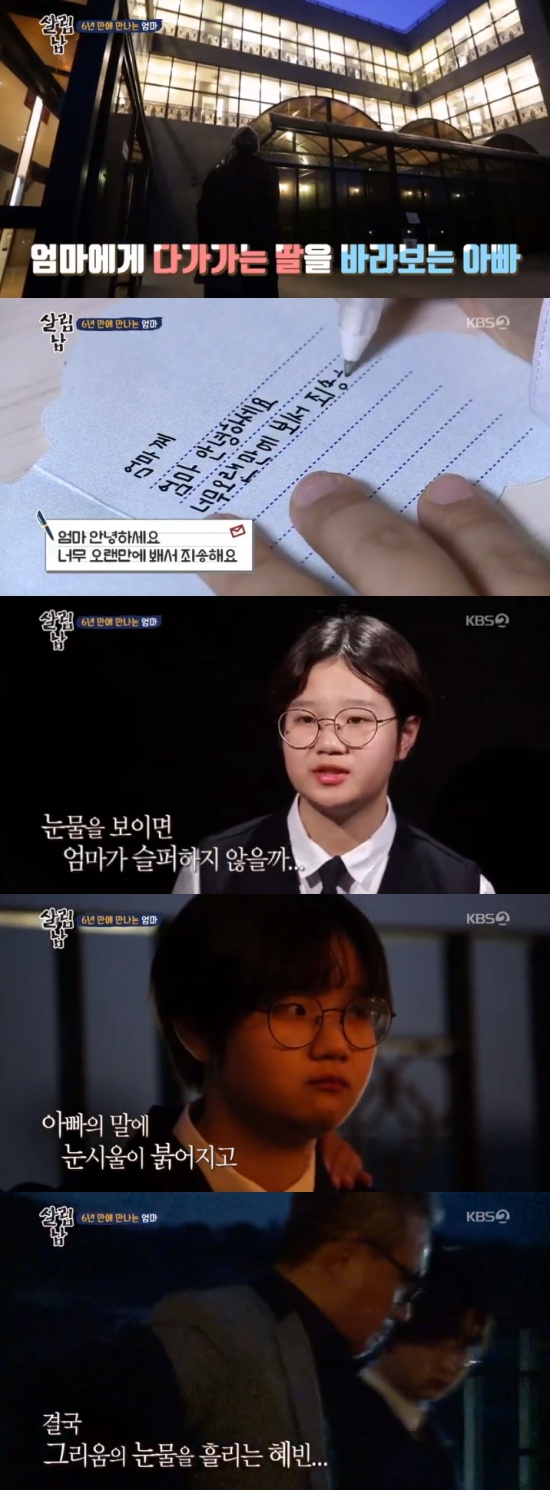 특히 김성수는 납골당에 도착한 뒤 "네가 엄마랑 만난 지 오래됐으니까 할 이야기도 많을 거 아니냐. 오늘은 혜빈이 너만 올라가서 네가 하고 싶은 이야기 다 하고 편지도 드리고 네가 만든 꽃도 드리고 아까 우리가 찍은 사진도 드리고 내려와라. 하고 싶었던 이야기 다 하고 울고 싶으면 울어라"라며 당부했다.