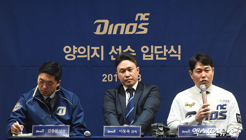 [엑스포츠뉴스 창원, 박지영 기자] 8일 오후 경상남도 창원시 마산합포구 사보이호텔에서 양의지의 NC 다이노스 입단식이 열렸다.