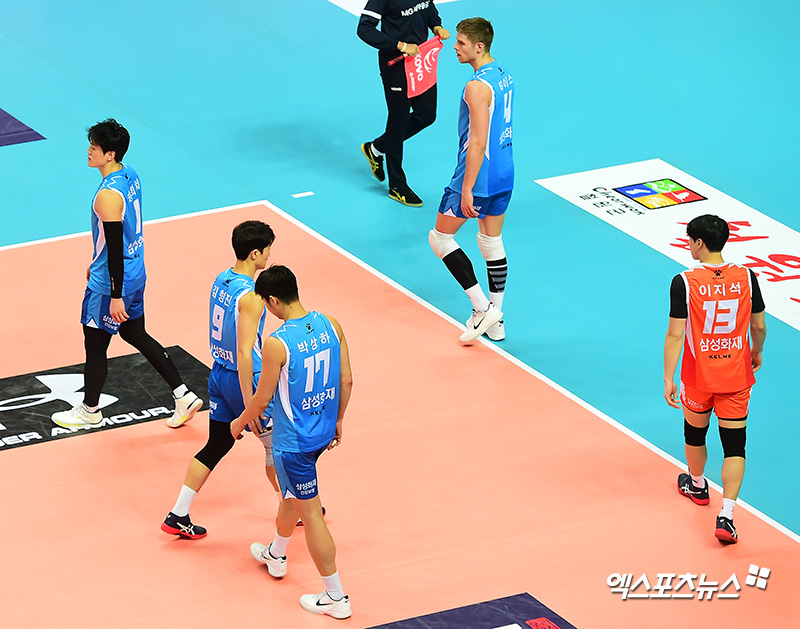 경기종료 후 삼성화재 선수들이 아쉬워하고 있다.