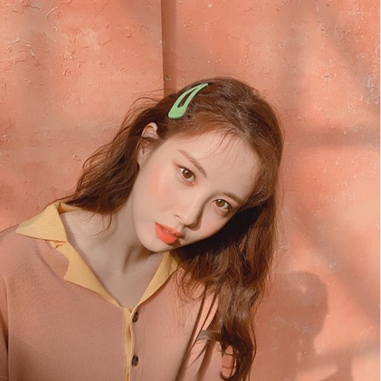 주황색 립스틱과 볼터치가 사랑스러운 느낌을 자아내는 동시에, 발랄한 분위기까지 더해 눈길을 사로잡는다.