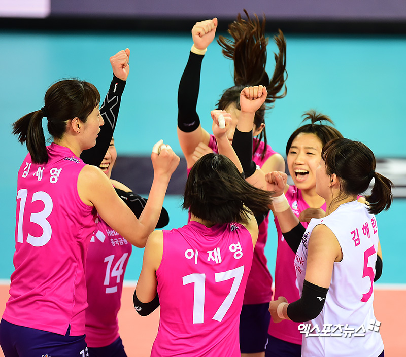 이날 경기에서 승리한 흥국생명 선수들이 기뻐하고 있다.