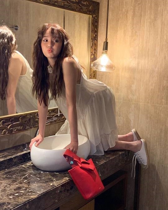 이주연은 민소매 원피스를 입은 채 세면대 위에 올라가 있는데, 독특한 분위기가 눈길을 사로잡는다.