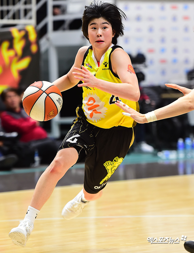 [엑스포츠뉴스 서수원, 김한준 기자] 7일 오후 경기도 서수원 칠보체육관에서 열린 '2018-2019 우리은행' 여자프로농구 OK저축은행과 우리은행의 경기, OK저축은행 이소희가 돌파를 시도하고 있다.