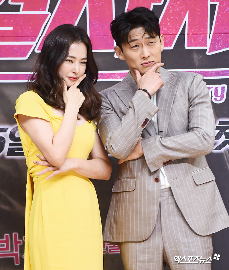 [엑스포츠뉴스 윤다희 기자] 15일 오후 서울 목동 SBS에서 열린 SBS 첫 금토드라마 '열혈사제' 제작발표회에 참석한 배우 이하늬, 고준이 포토타임을 갖고 있다.