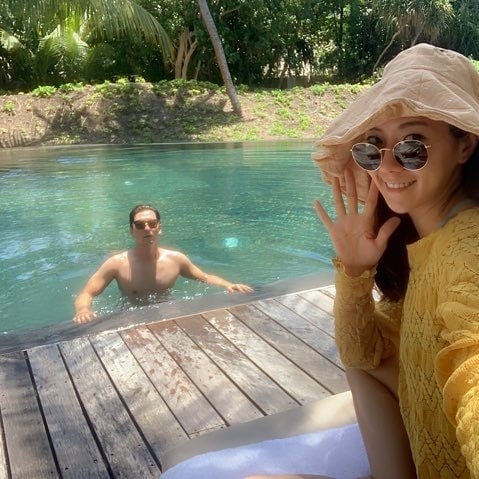 서수연과 신혼여행을 떠난 이필모는 다정하게 여행을 즐기고 있는 모습이다. 사진 속 이필모는 수영장에서 수영을 즐기고 있으며, 서수연은 화사한 미소와 함께 카메라를 응시하고 있다.