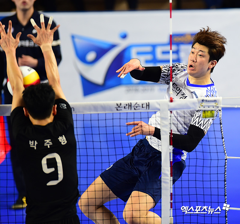 [엑스포츠뉴스 천안, 김한준 기자] 16일 오후 충청남도 천안유관순체육관에서 열린 '2018-2019 도드람 V리그' 현대캐피탈과 우리카드의 남자부 플레이오프 1차전 경기, 우리카드 나경복이 공격을 시도하고 있다.