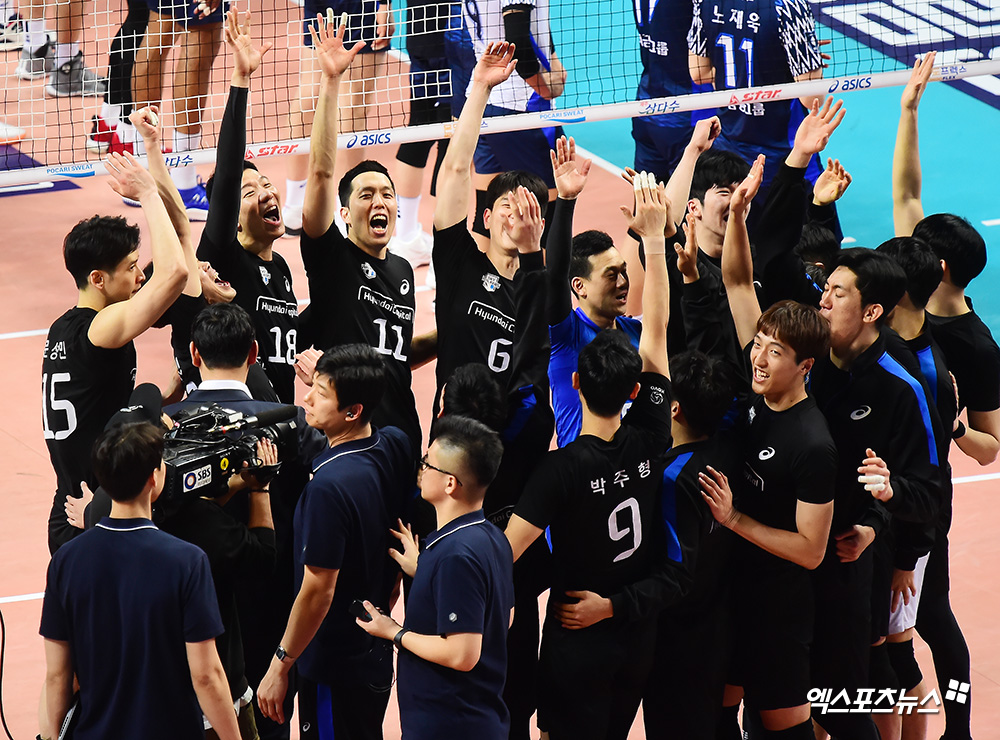 [엑스포츠뉴스 장충, 김한준 기자] 18일 오후 서울 중구 장충체육관에서 열린 우리카드와 현대캐피탈의 남자부 플레이오프 2차전 경기, 현대캐피탈이 우리카드에 세트스코어 3:0(32-30. 25-21, 25-12)으로 승리하며 챔피언결정전 티켓을 따냈다.