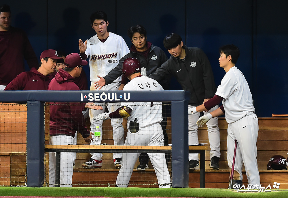 [엑스포츠뉴스 고척, 김한준 기자] 19일 오후 서울 구로구 고척스카이돔에서 열린 '2019 신한은행 마이카 KBO 시범경기' KIA 타이거즈와 키움 히어로즈의 경기, 3회말 키움 김하성이 솔로 홈런을 날린 후 더그아웃에서 하이파이브를 하고 있다.