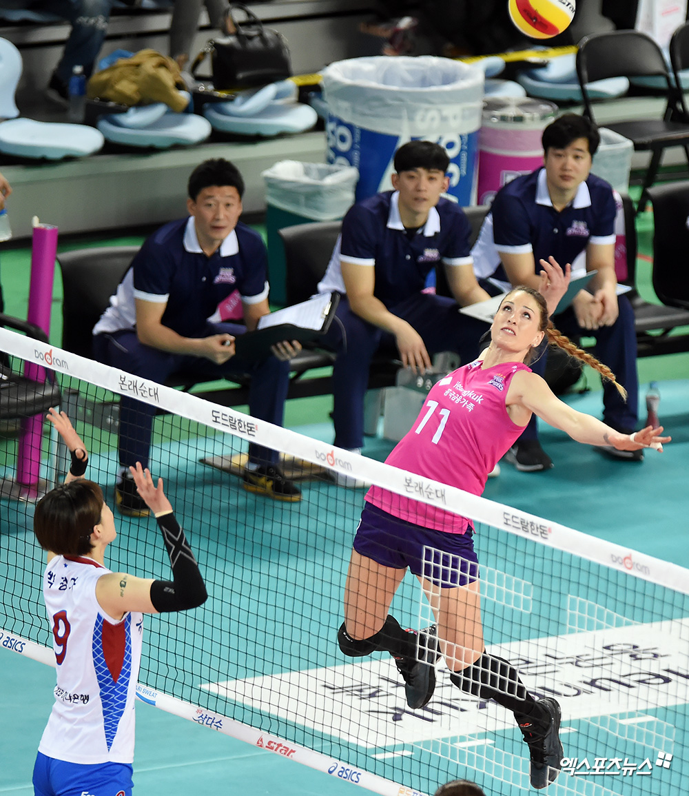 [엑스포츠뉴스 계양, 김한준 기자] 21일 오후 인천 계양체육관에서 열린 '2018-2019 도드람 V리그' 흥국생명과 한국도로공사의 여자부 챔피언 결정전 1차전 경기, 흥국생명 톰시아가 공격을 시도하고 있다.
