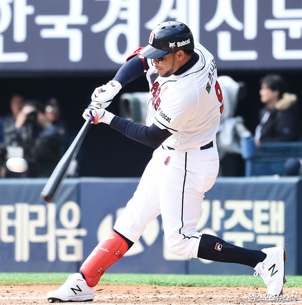 [엑스포츠뉴스 잠실, 박지영 기자] 23일 오후 서울 송파구 잠실야구장에서 열린 '2019 신한은행 MY CAR KBO리그' 한화 이글스와 두산 베어스의 개막전 경기, 2회말 무사 1루 두산 페르난데스가 타격하고 있다. 결과는 1루주자 병살타 아웃.