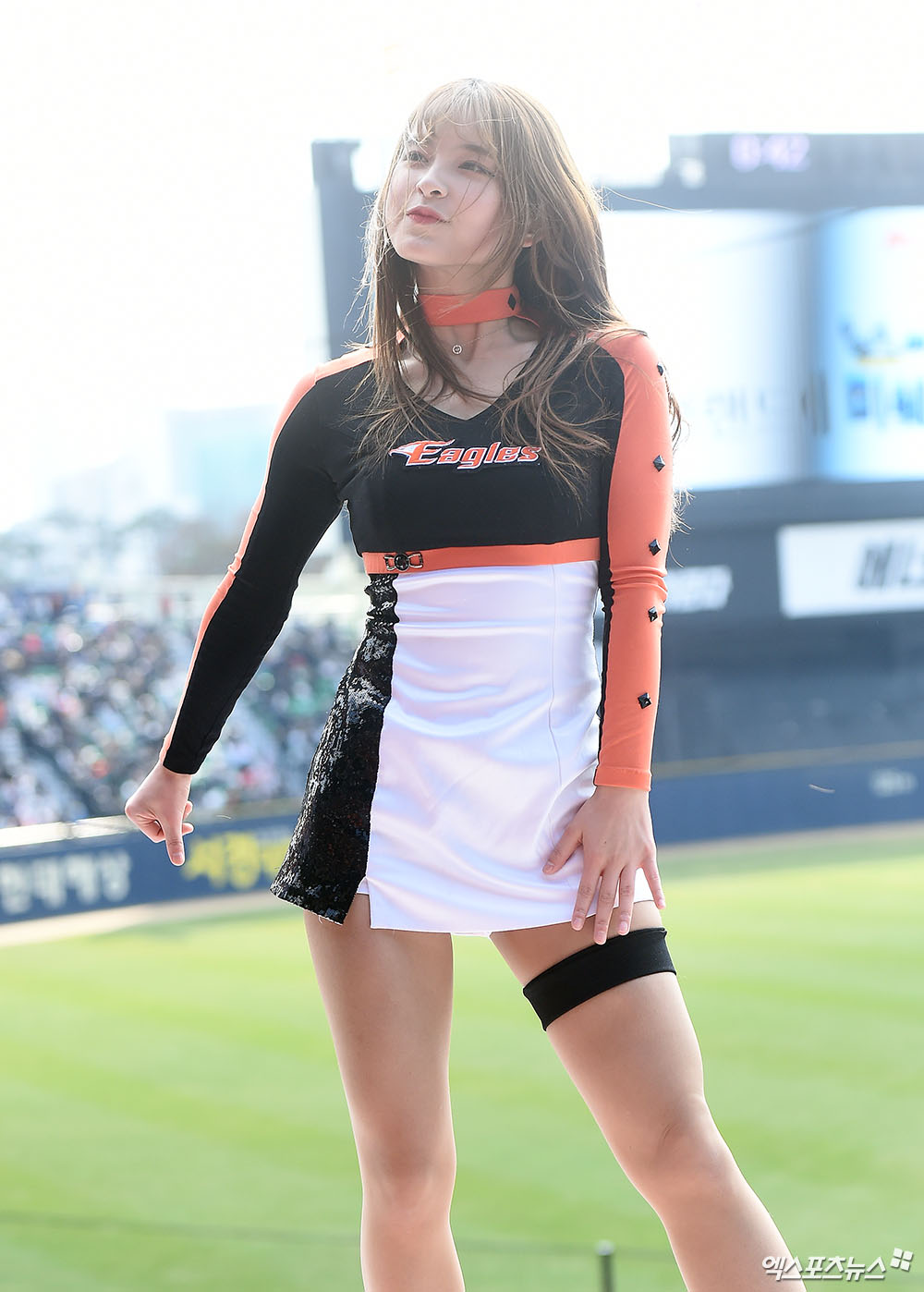 [엑스포츠뉴스 잠실, 박지영 기자] 23일 오후 서울 송파구 잠실야구장에서 열린 '2019 신한은행 MY CAR KBO리그' 한화 이글스와 두산 베어스의 개막전 경기, 한화 치어리더 이은지가 멋진 공연을 선보이고 있다.