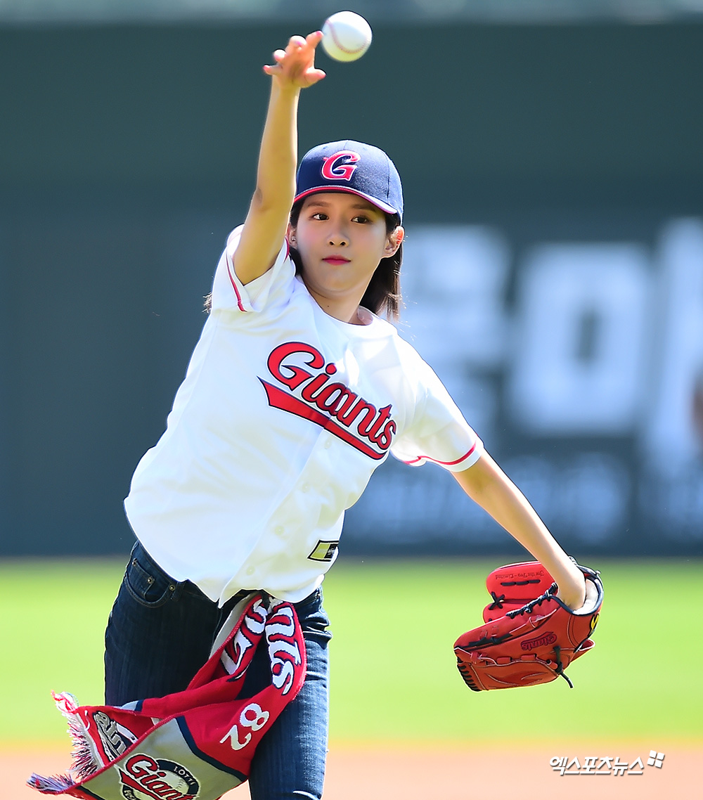 [엑스포츠뉴스 부산, 김한준 기자] 24일 오후 부산 동래구 사직야구장에서 열린 '2019 신한은행 MY CAR KBO리그 키움 히어로즈와 롯데 자이언츠의 경기, 경기 전 우주소녀 엑시가 시구에 임하고 있다.