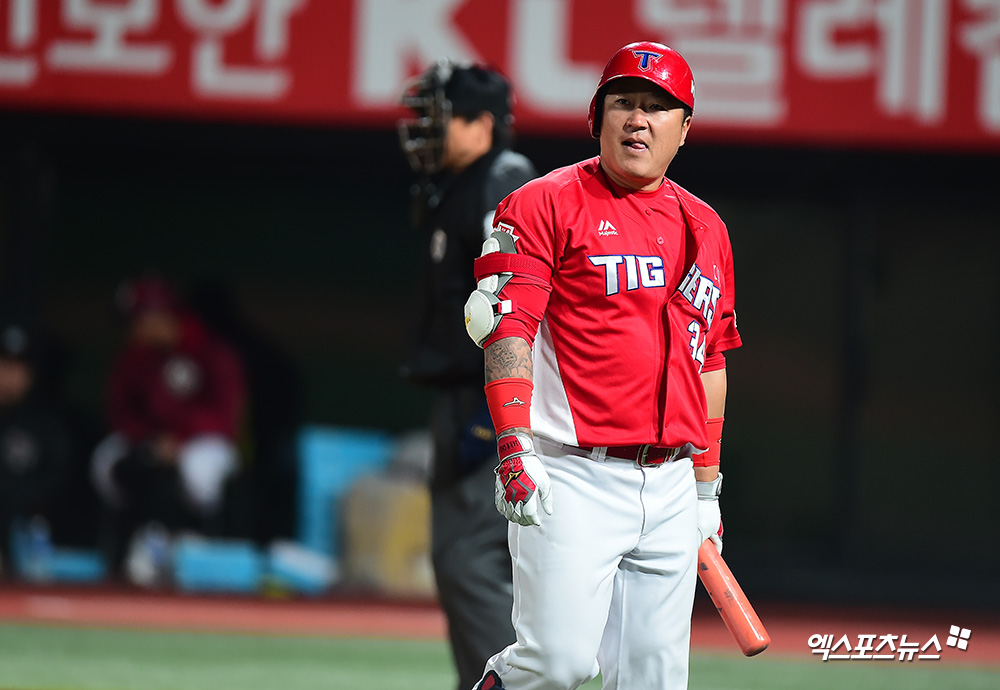 [엑스포츠뉴스 수원, 김한준 기자] 29일 오후 경기도 수원시 장안구 수원kt위즈파크에서 열린 '2019 신한은행 MY CAR KBO리그 KIA 타이거즈와 KT 위즈의 경기, 4회초 무사 1루 KIA 최형우가 헛스윙 삼진을 당한 후 아쉬워하고 있다.