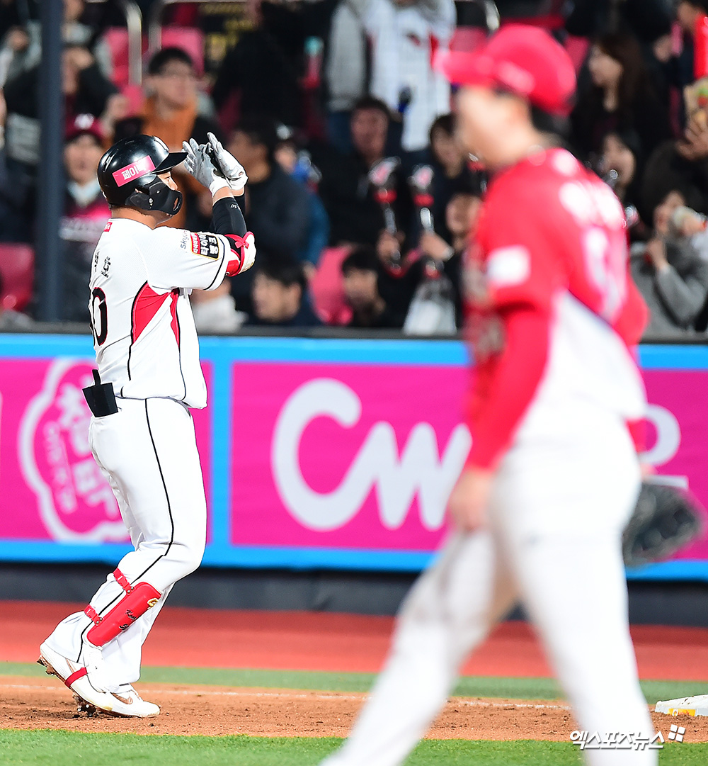 [엑스포츠뉴스 수원, 김한준 기자] 29일 오후 경기도 수원시 장안구 수원kt위즈파크에서 열린 '2019 신한은행 MY CAR KBO리그 KIA 타이거즈와 KT 위즈의 경기, 6회말 2사 2루 KT 강백호가 1타점 적시타를 날린 후 세리머니를 하고 있다.