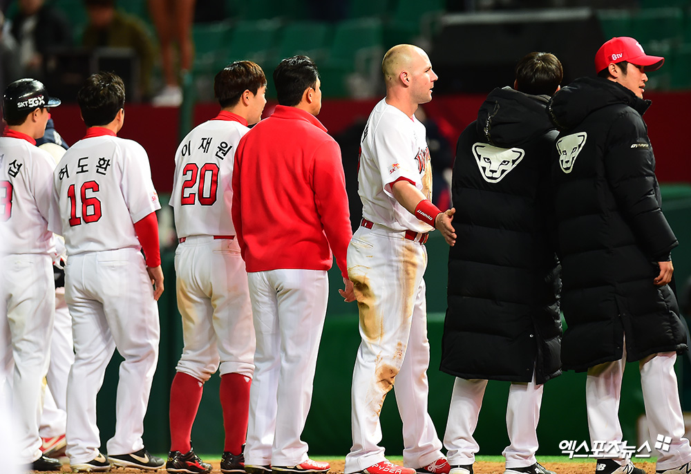 경기종료 후 SK 선수들이 그라운드에서 관중석을 향해 인사를 하고 있다.