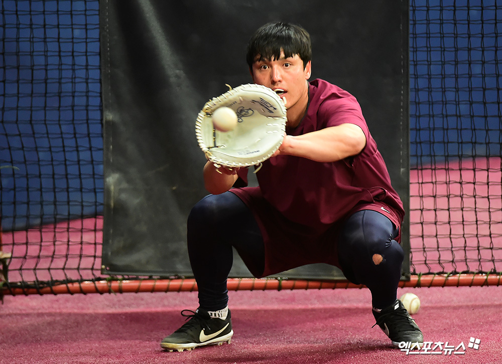 [엑스포츠뉴스 고척, 김한준 기자] 9일 오후 서울 구로구 고척스카이돔에서 열리는 '2019 신한은행 MY CAR KBO리그 KT 위즈와 키움 히어로즈의 경기, 키움 박동원이 훈련에 임하고 있다.