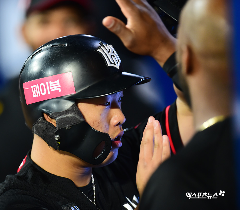 [엑스포츠뉴스 고척, 김한준 기자] 9일 오후 서울 구로구 고척스카이돔에서 열린 '2019 신한은행 MY CAR KBO리그 KT 위즈와 키움 히어로즈의 경기, 1회초 2사 1,2루 KT 강백호가 윤석민의 1타점 적시타때 득점에 성공한 후 더그아웃에서 하이파이브를 하고 있다.