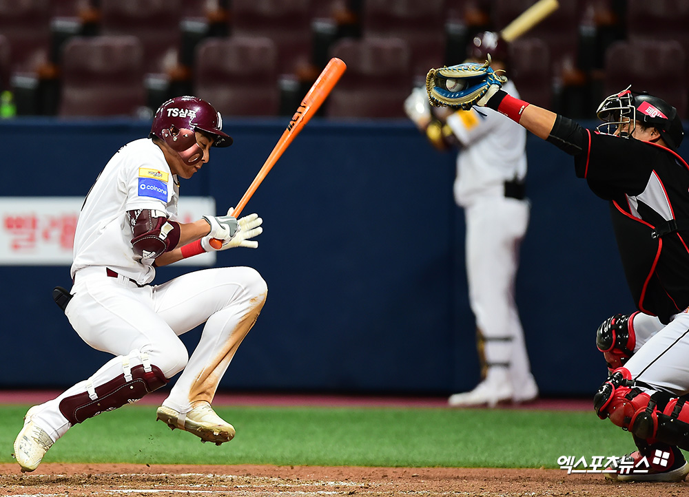 [엑스포츠뉴스 고척, 김한준 기자] 9일 오후 서울 구로구 고척스카이돔에서 열린 '2019 신한은행 MY CAR KBO리그 KT 위즈와 키움 히어로즈의 경기, 7회말 무사 1,3루 키움 이정후가 KT 이종혁의 높은공에 깜짝 놀라고 있다.