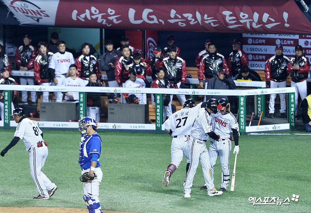 [엑스포츠뉴스 잠실, 김한준 기자] 10일 오후 서울 송파구 잠실야구장에서 열린 '2019 신한은행 MY CAR KBO리그 삼성 라이온즈와 LG 트윈스의 경기, 2회말 1사 3루 LG 유강남이 투런 홈런을 날린 후 축하를 받고 있다.