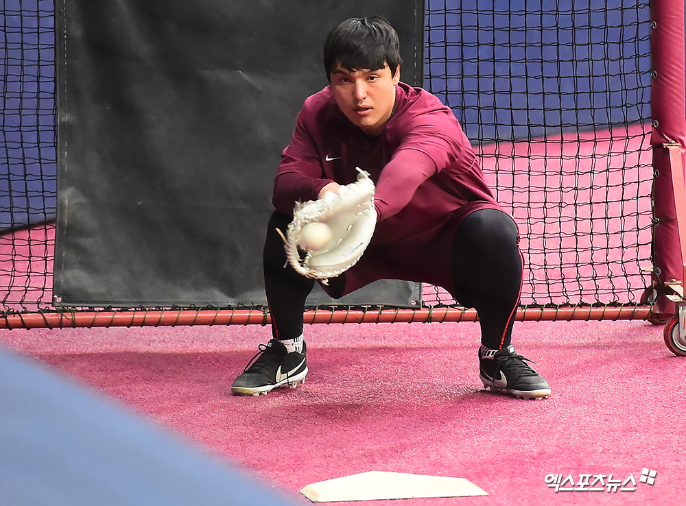 [엑스포츠뉴스 고척, 김한준 기자] 11일 오후 서울 구로구 고척스카이돔에서 열리는 '2019 신한은행 MY CAR KBO리그 KT 위즈와 키움 히어로즈의 경기, 키움 박동원이 훈련에 임하고 있다.