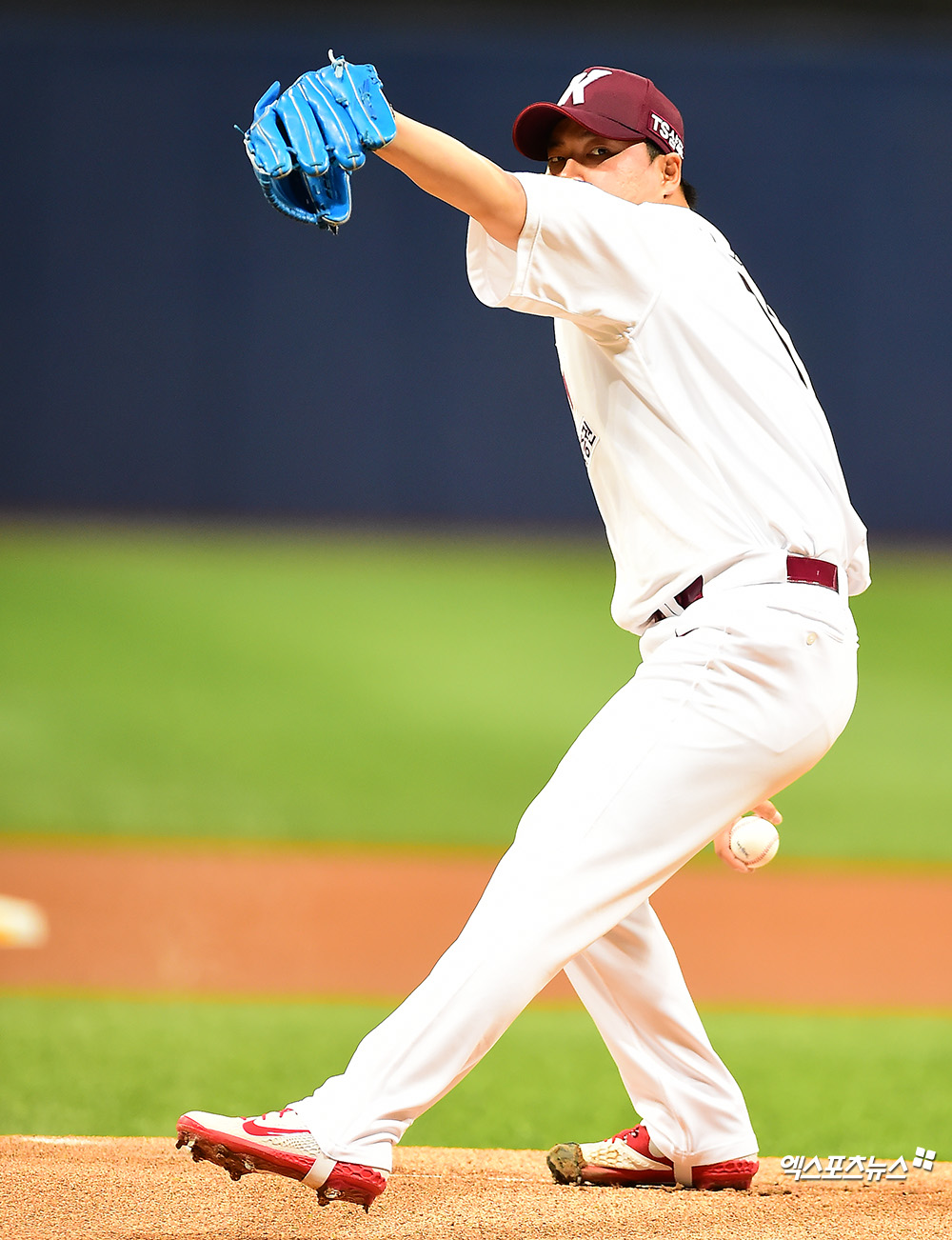[엑스포츠뉴스 고척, 김한준 기자] 11일 오후 서울 구로구 고척스카이돔에서 열린 '2019 신한은행 MY CAR KBO리그 KT 위즈와 키움 히어로즈의 경기, 1회초 키움 선발투수 김동준이 공을 힘차게 던지고 있다.