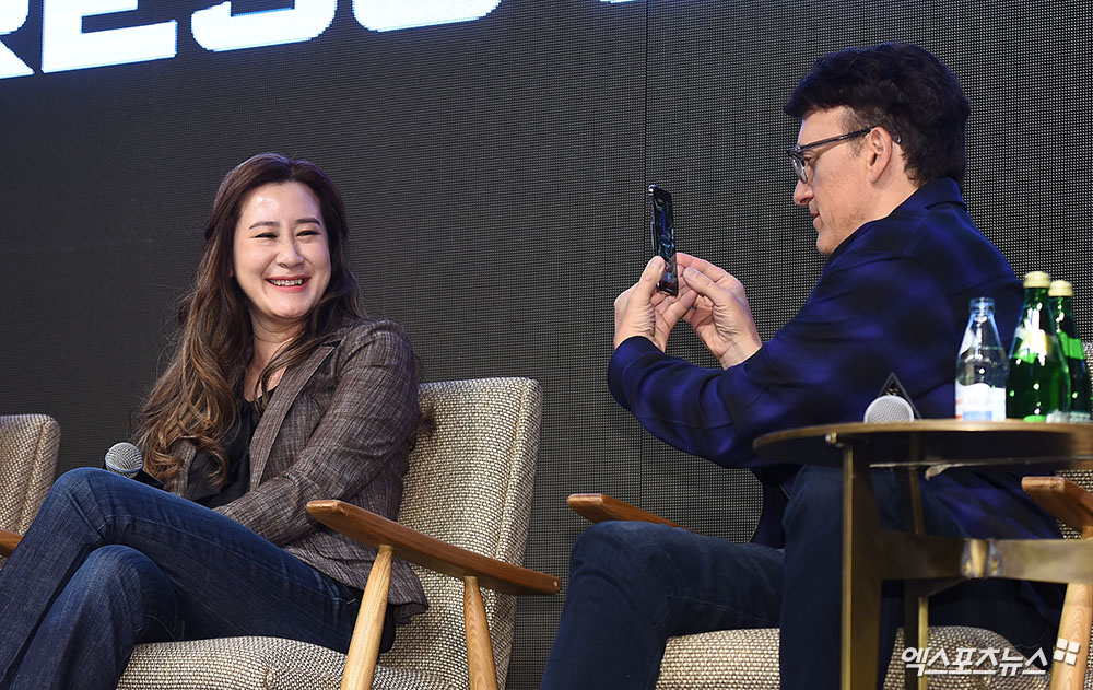 [엑스포츠뉴스 박지영 기자] 15일 오전 서울 당주동 포시즌스호텔에서 열린 영화 '어벤져스: 엔드게임' 아시아 프레스 컨퍼런스에 참석한 트린 트랜 프로듀서와 안소니 루소 감독이 사진 촬영을 하며 즐거운 시간을 보내고 있다.
