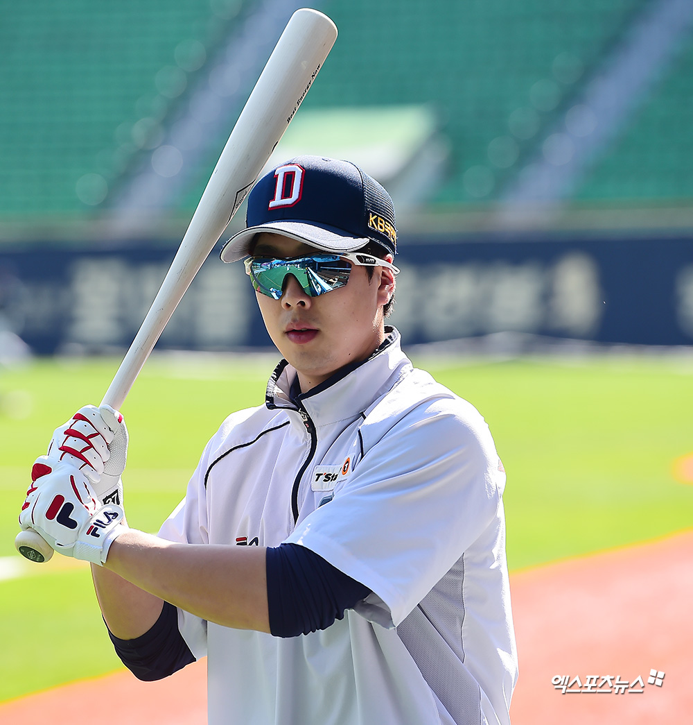 [엑스포츠뉴스 잠실, 김한준 기자] 17일 오후 서울 송파구 잠실야구장에서 열리는 '2019 신한은행 MY CAR KBO리그 SK 와이번스와 두산 베어스의 경기, 두산 박건우가 훈련에 임하고 있다.