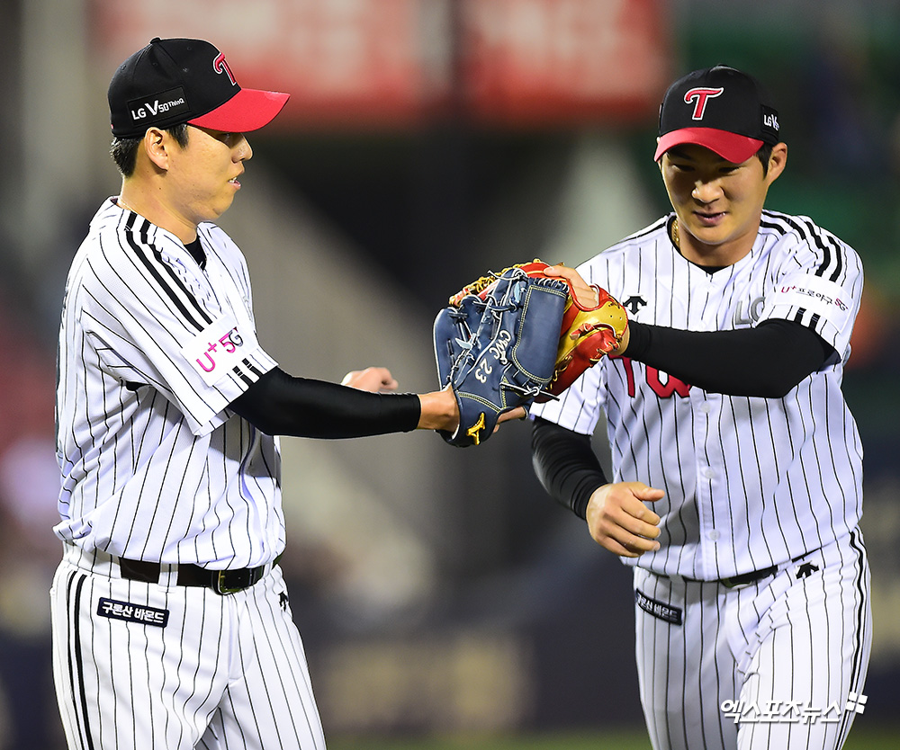 [엑스포츠뉴스 잠실, 김한준 기자] 24일 오후 서울 송파구 잠실야구장에서 열린 '2019 신한은행 MY CAR KBO리그' KIA 타이거즈와 LG 트윈스의 경기, 5회초 수비를 마친 LG 선발투수 차우찬이 오지환과 하이파이브를 하고 있다.