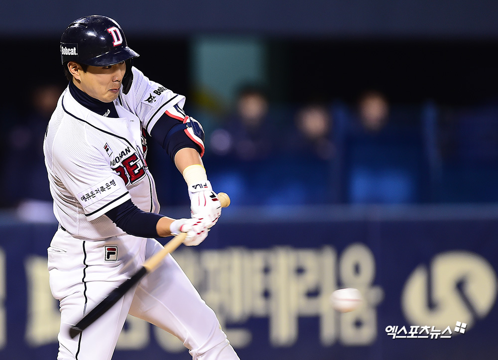 [엑스포츠뉴스 잠실, 김한준 기자] 27일 오후 서울 송파구 잠실야구장에서 열린 '2019 신한은행 MY CAR KBO리그' 롯데 자이언츠와 두산 베어스의 경기, 7회말 무사 1,3루 두산 박건우가 1타점 희생플라이 타구를 날리고 있다.