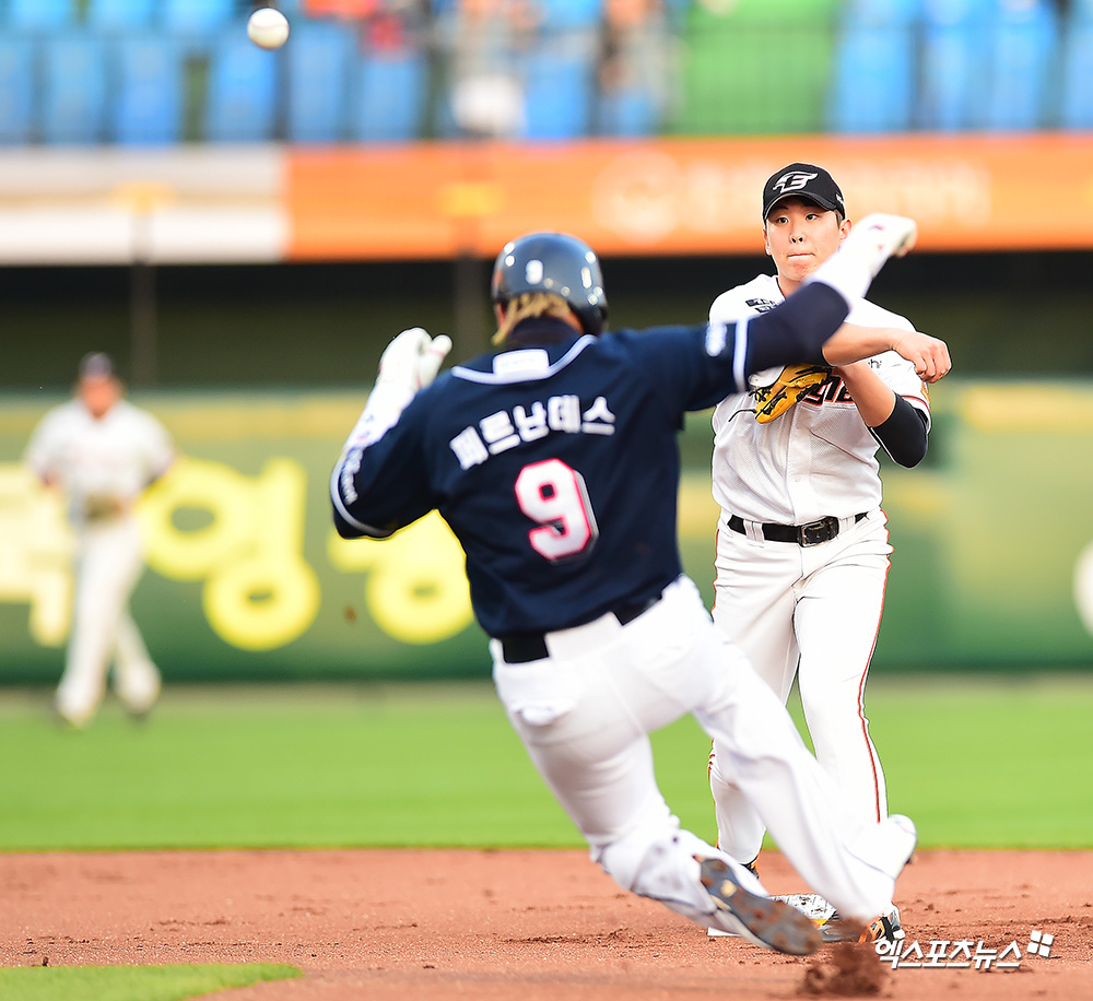 [엑스포츠뉴스 대전, 김한준 기자] 30일 오후 대전광역시 중구 한화생명이글스파크에서 열린 '2019 신한은행 MY CAR KBO리그 두산 베어스와 한화 이글스의 경기, 1회초 1사 1루 한화 정은원이 두산 박건우의 내야땅볼때 페르난데스를 포스아웃 시킨 후 1루로 송구하고 있다.