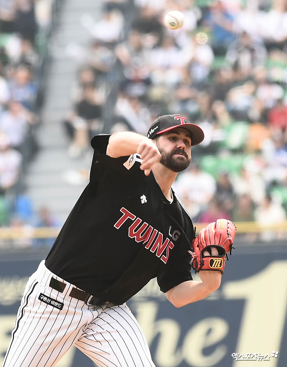 [엑스포츠뉴스 잠실, 윤다희 기자] 4일 오후 서울 송파구 잠실야구장에서 열린 '2019 신한은행 MY CAR KBO리그' LG 트윈스와 두산 베어스의 경기, 1회말 무사 LG 선발투수 켈리가 공을 힘차게 던지고 있다.
