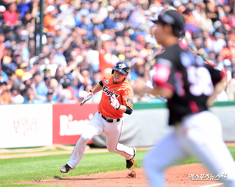 [엑스포츠뉴스 대전, 김한준 기자] 5일 오후 대전광역시 중구 한화생명이글스파크에서 열린 '2019 신한은행 MY CAR KBO리그 KT 위즈와 한화 이글스의 경기, 1회말 1사 1,2루 한화 정은원이 1타점 적시타때 홈으로 쇄도하고 있다.