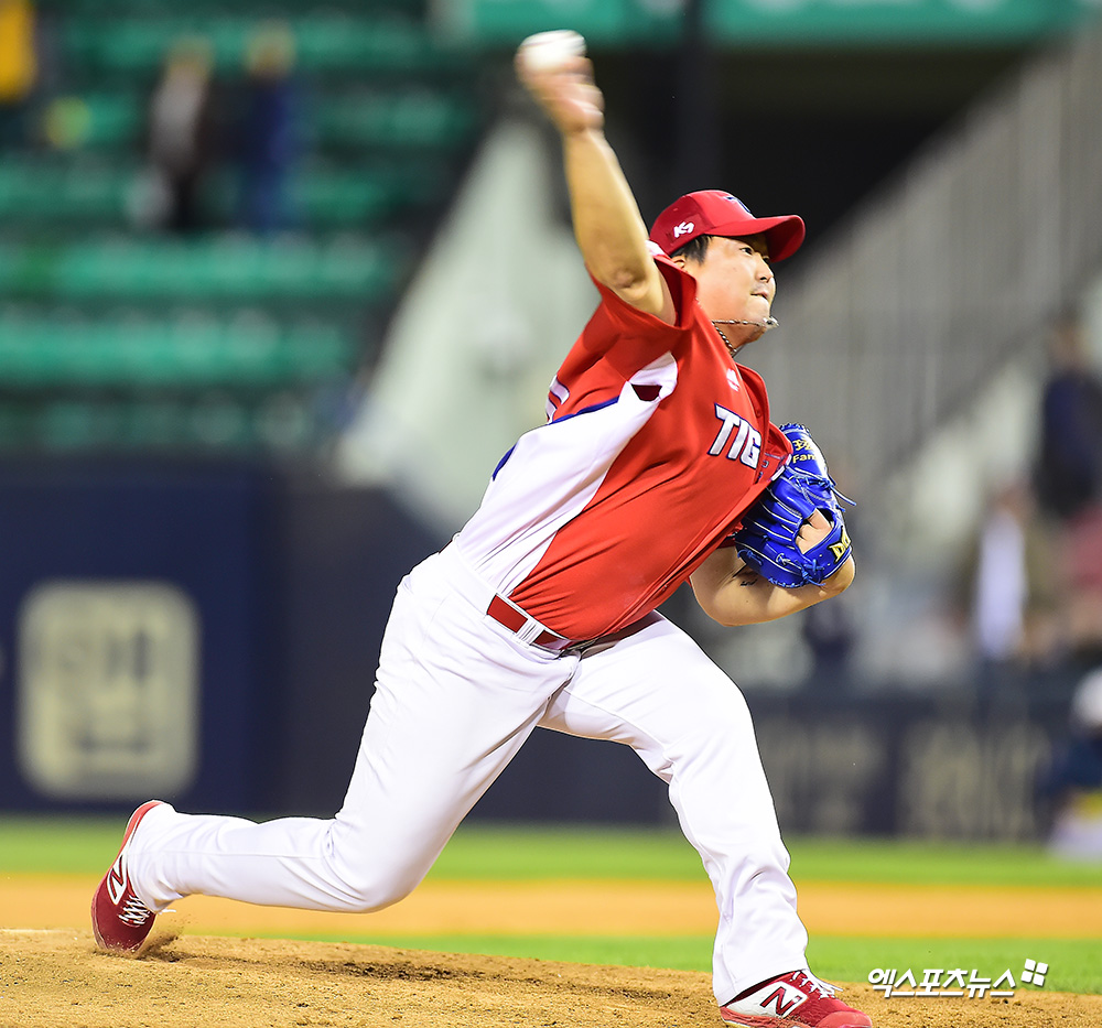 [엑스포츠뉴스 잠실, 김한준 기자] 7일 오후 서울 송파구 잠실야구장에서 열린 '2019 신한은행 MY CAR KBO리그' KIA 타이거즈와 두산 베어스의 경기, 8회말 1사 3루 KIA 김세현이 공을 힘차게 던지고 있다.