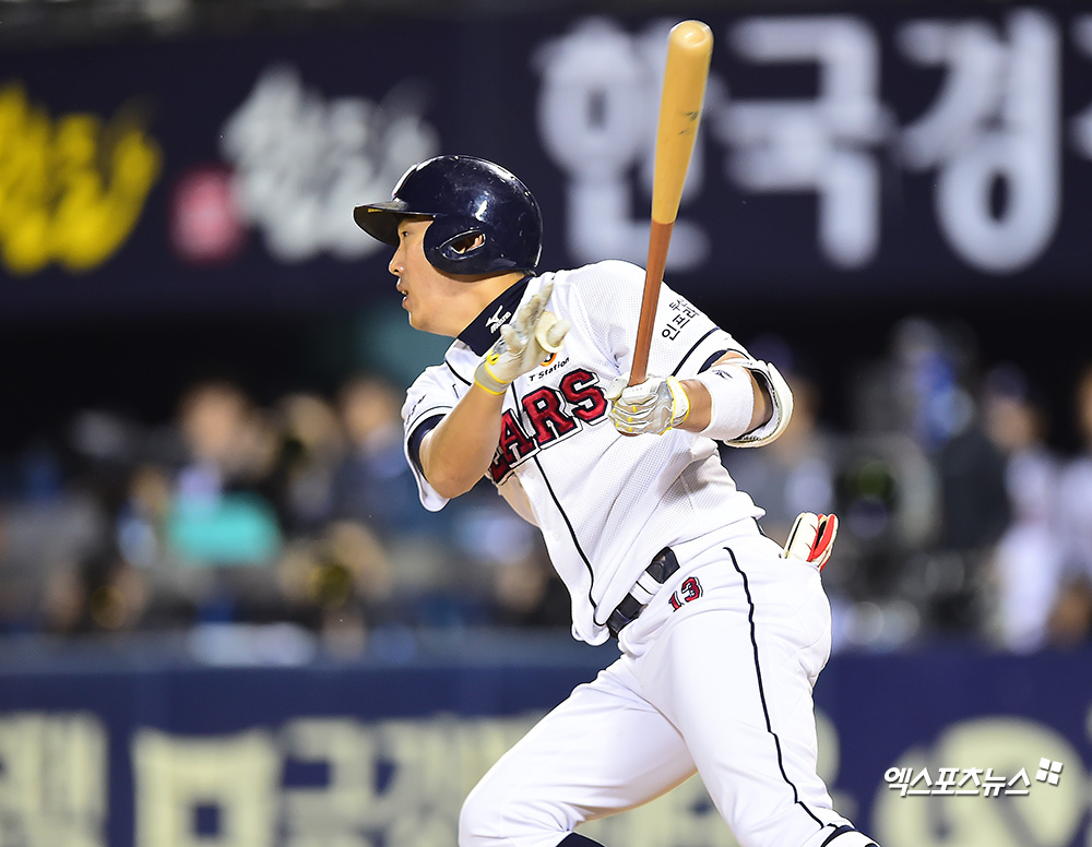 9회말 2사 2루 두산 허경민이 끝내기 안타를 날리고 있다.