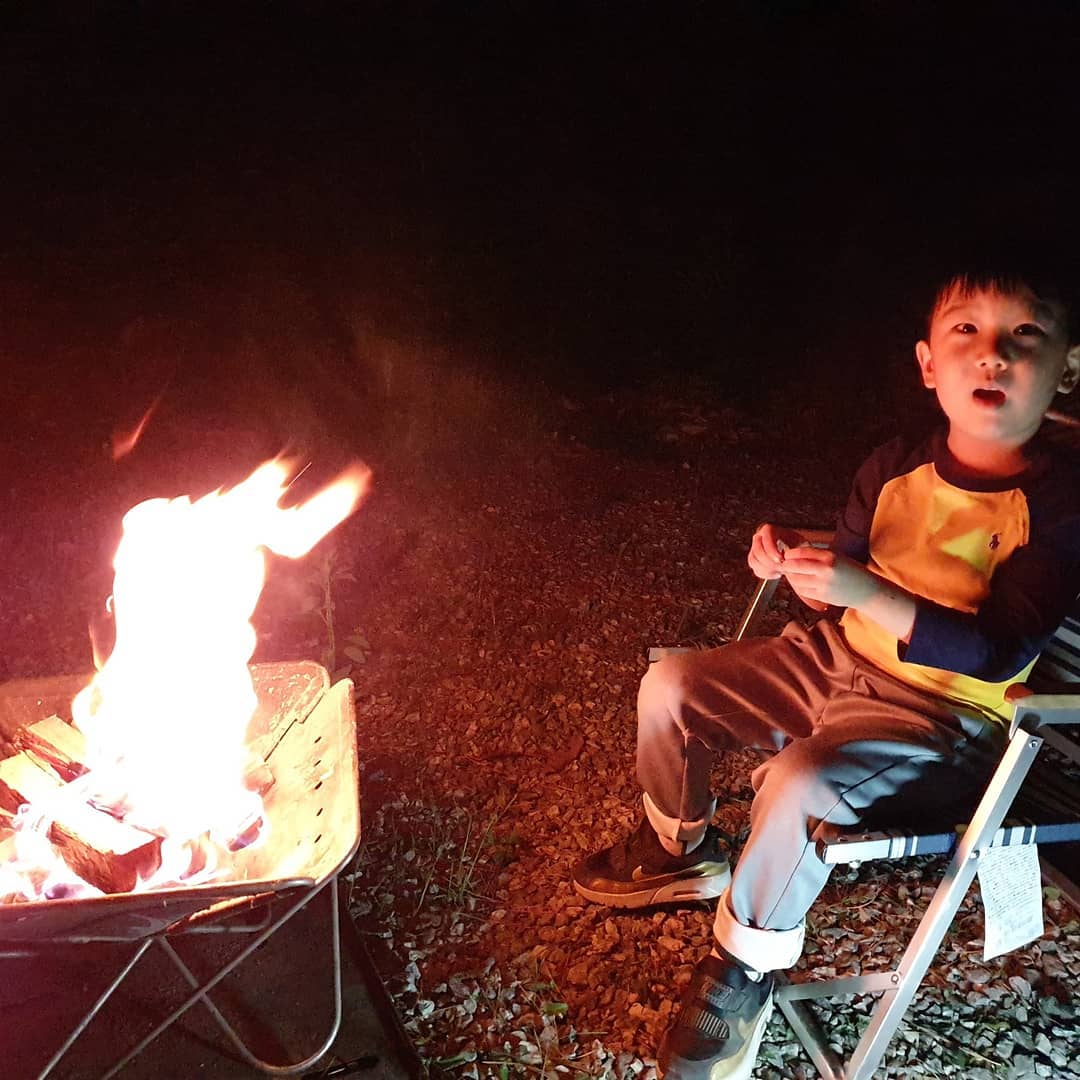 사진 속 연우 군은 편안한 옷차림으로 캠핑을 즐기고 있는 모습이다.