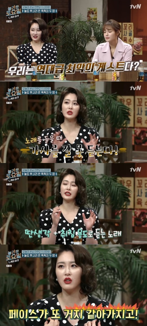이날 신아영은 받아쓰기 실력을 걱정하며 "난 노래를 들을 때 가사를 잘 못 듣는다. 가사를 안 듣고 멜로디만 듣는다"고 밝혔다.