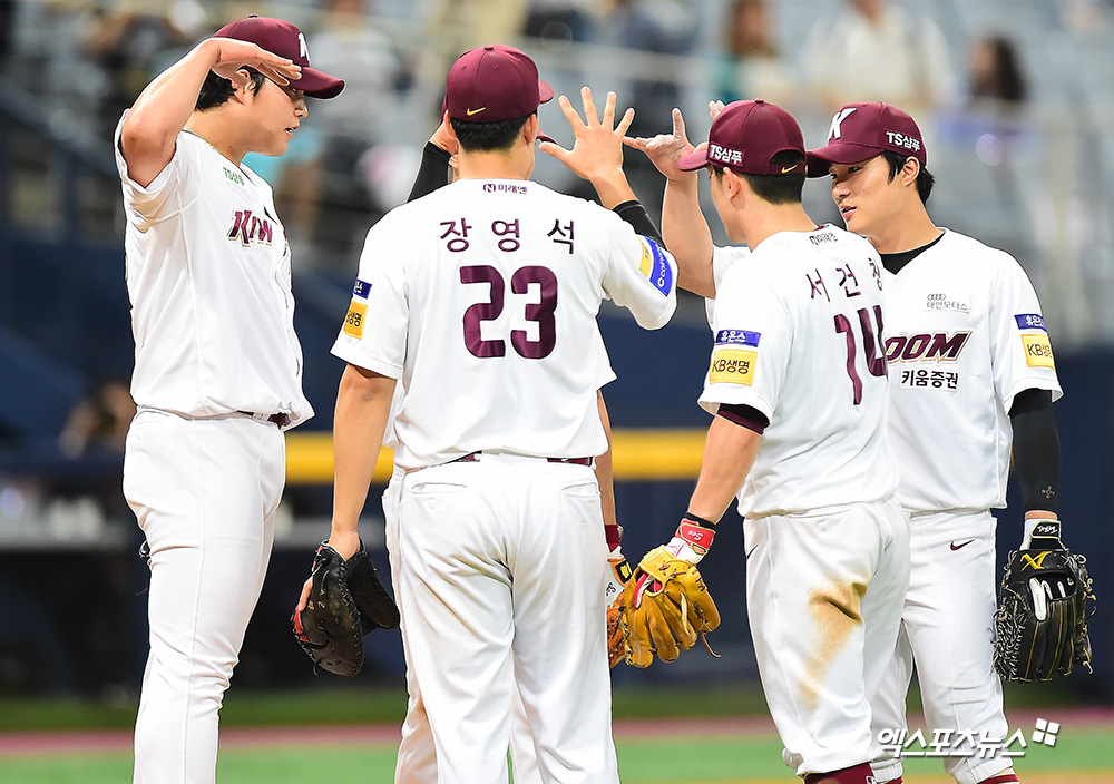 이날 경기에서 승리한 키움 선수들이 기뻐하고 있다.