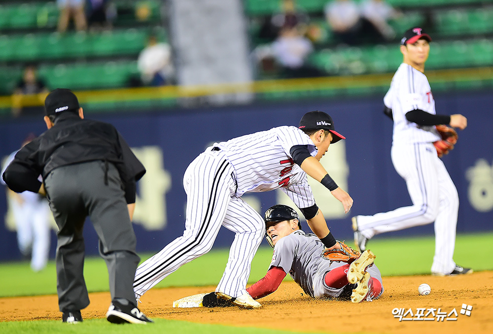 [엑스포츠뉴스 잠실, 김한준 기자] 23일 오후 서울 송파구 잠실야구장에서 열린 '2019 신한은행 MY CAR KBO리그' SK 와이번스와 LG 트윈스의 경기, 8회초 2사 1루 SK 김재현이 2루 도루를 시도하고 있다.