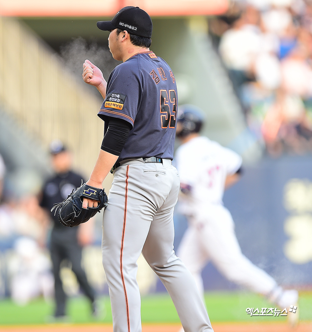 [엑스포츠뉴스 잠실, 김한준 기자] 25일 오후 서울 송파구 잠실야구장에서 열린 '2019 신한은행 MY CAR KBO리그' 한화 이글스와 두산 베어스의 경기, 4회말 2사 1루 한화 선발투수 김민우가 두산 박건우에게 투런 홈런을 허용한 후 아쉬워하고 있다.