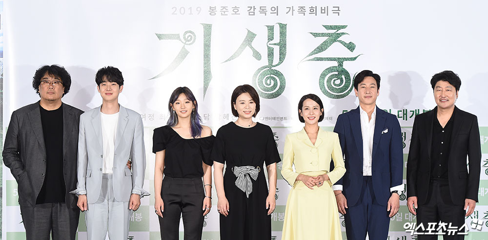 [엑스포츠뉴스 박지영 기자] 28일 오후 서울 용산구 CGV 용산아이파크몰점에서 열린 영화 '기생충' 언론시사회에 참석한 봉준호 감독, 배우 최우식, 박소담, 장혜진, 조여정, 이선균, 송강호가 포즈를 취하고 있다.