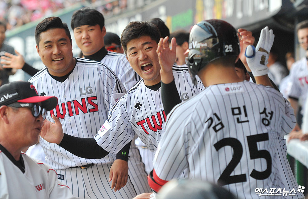 [엑스포츠뉴스 잠실, 박지영 기자] 1일 오후 서울 송파구 잠실야구장에서 열린 '2019 신한은행 MY CAR KBO리그' NC 다이노스와 LG 트윈스의 경기, 2회말 2사 LG 김민성이 솔로 홈런을 때려낸 뒤 더그아웃에서 동료들의 축하를 받고 있다.