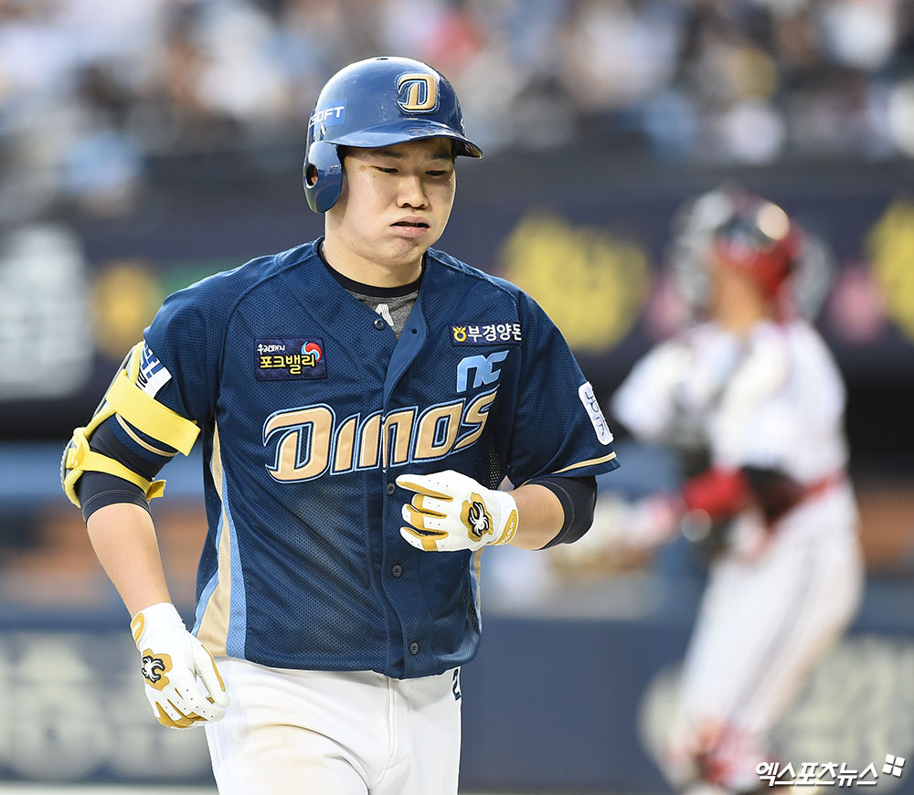 [엑스포츠뉴스 잠실, 박지영 기자] 1일 오후 서울 송파구 잠실야구장에서 열린 '2019 신한은행 MY CAR KBO리그' NC 다이노스와 LG 트윈스의 경기, 8회초 무사 1루 NC 박민우가 병살 아웃으로 물러나며 아쉬워하고 있다.
