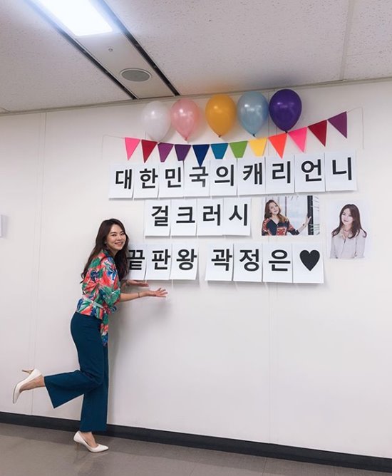 사진 속에는 '대한민국의 캐리언니, 걸크러시 끝판왕 곽정은'이라고 적힌 메시지 앞에서 발랄한 포즈를 취하며 행복한 미소를 짓고 있다.