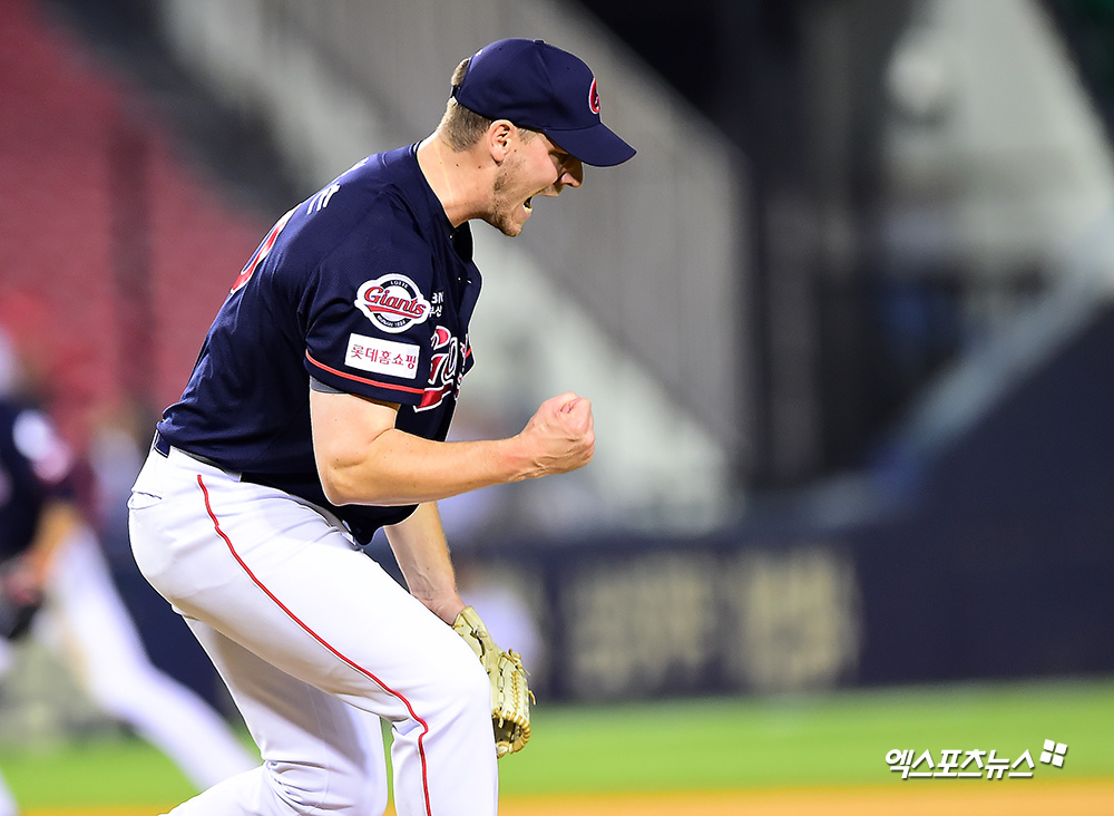 [엑스포츠뉴스 잠실, 김한준 기자] 13일 오후 서울 송파구 잠실야구장에서 열린 '2019 신한은행 MY CAR KBO리그 롯데 자이언츠와 LG 트윈스의 경기. 6회말 2사 3루 롯데 선발투수 다익손이 LG 조셉을 삼진으로 처리한 후 포효하고 있다.