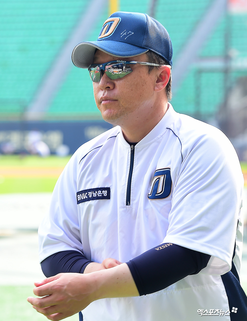 [엑스포츠뉴스 잠실, 김한준 기자] 20일 오후 서울 송파구 잠실야구장에서 열리는 '2019 신한은행 MY CAR KBO리그 NC 다이노스와 두산 베어스의 경기, NC 이동욱 감독이 선수들의 훈련을 지켜보고 있다.