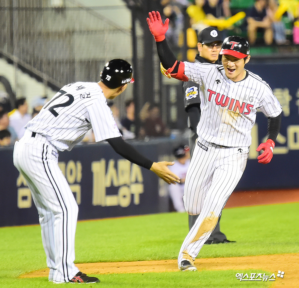 [엑스포츠뉴스 잠실, 김한준 기자] 21일 오후 서울 송파구 잠실야구장에서 열린 '2019 신한은행 MY CAR KBO리그 KIA 타이거즈와 LG 트윈스의 경기, 5회말 1사 1,2루 LG 오지환이 역전 스리런 홈런을 날린 후 그라운드를 돌고 있다.