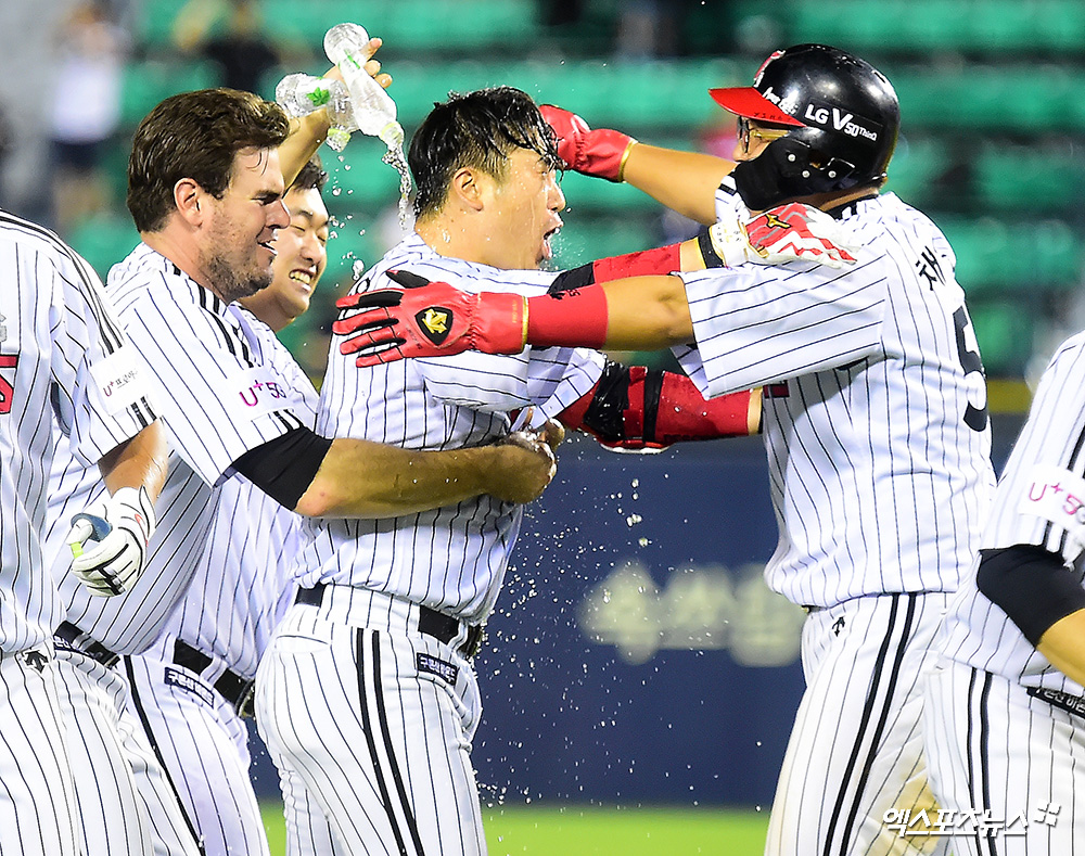 LG 이성우가 끝내기 안타를 날린 후 기뻐하고 있다.