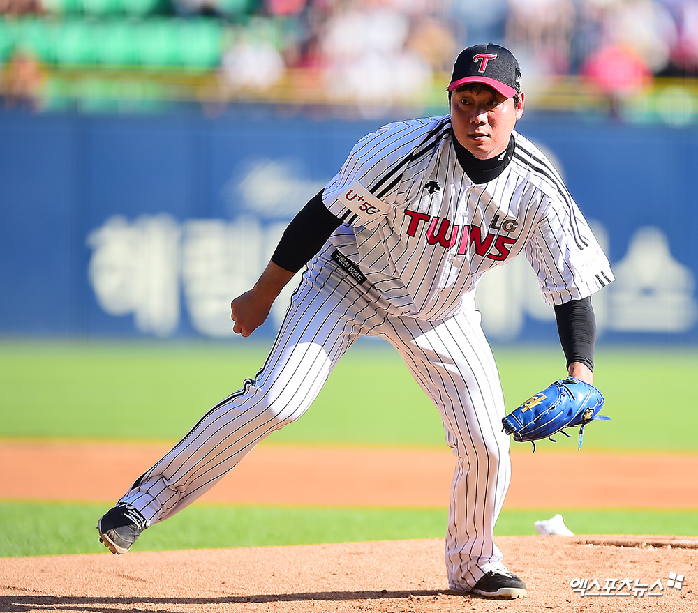 [엑스포츠뉴스 잠실, 김한준 기자] 22일 오후 서울 송파구 잠실야구장에서 열린 '2019 신한은행 MY CAR KBO리그 KIA 타이거즈와 LG 트윈스의 경기, 1회초 LG 선발투수 류제국이 공을 힘차게 던지고 있다.