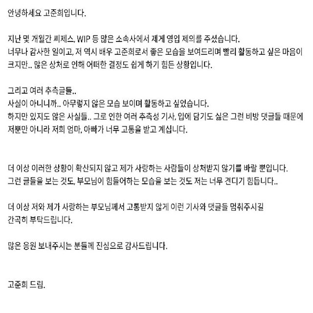 이는 고준희의 입장문. 고준희는 "많은 소속사가 영입 제안을 해줬다"며 "감사한 일이지만 많은 상처로 어떠한 결정도 쉽게 내리기 힘들다"고 적었다. 또한 "여러 추측성 기사, 비방 댓글들로 엄마, 아빠가 고통받고 있다"며 "이런 기사와 댓글을 멈춰달라"고 호소했다.